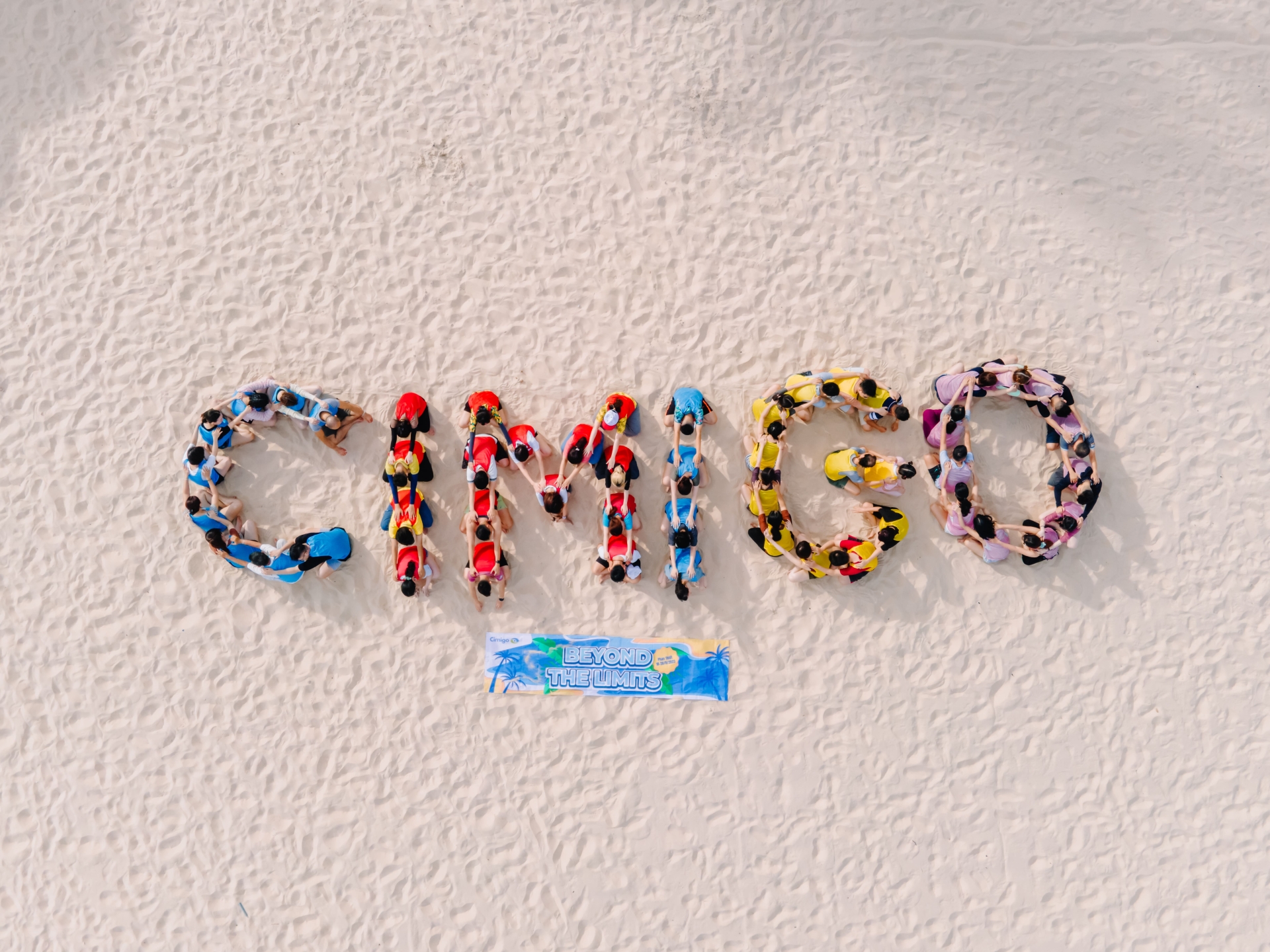 Ghi lại khoảnh khắc tất cả thành viên xếp đội hình tạo chữ “CIMIGO” trên bãi biển – concept đồng đội đầy ý nghĩa.